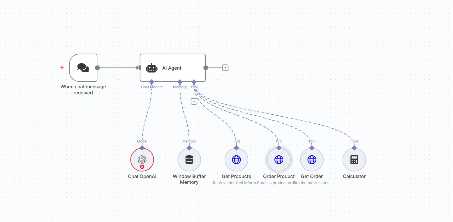 Chat Trigger β The user sends a message to OrderBot (the AI chatbot).