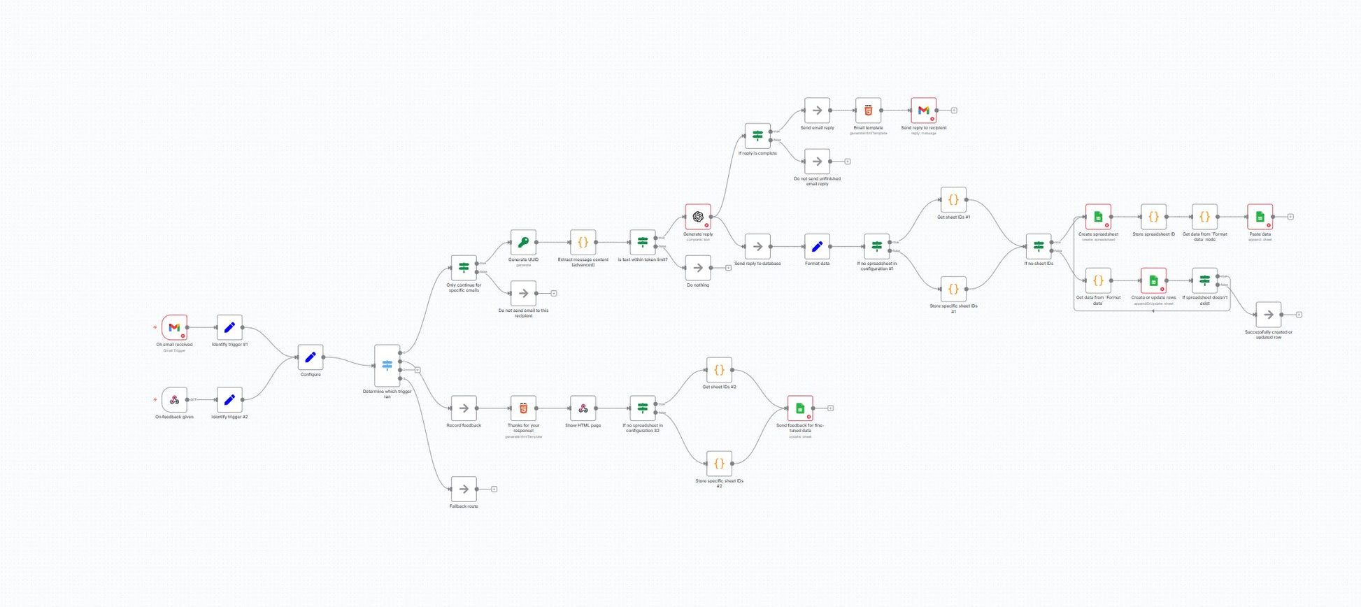 Creates a Google Sheet automatically if missing, stores IDs in workflow static data, and appends/updates rows with: ID, Initial Message, Generated Reply, and Feedback.