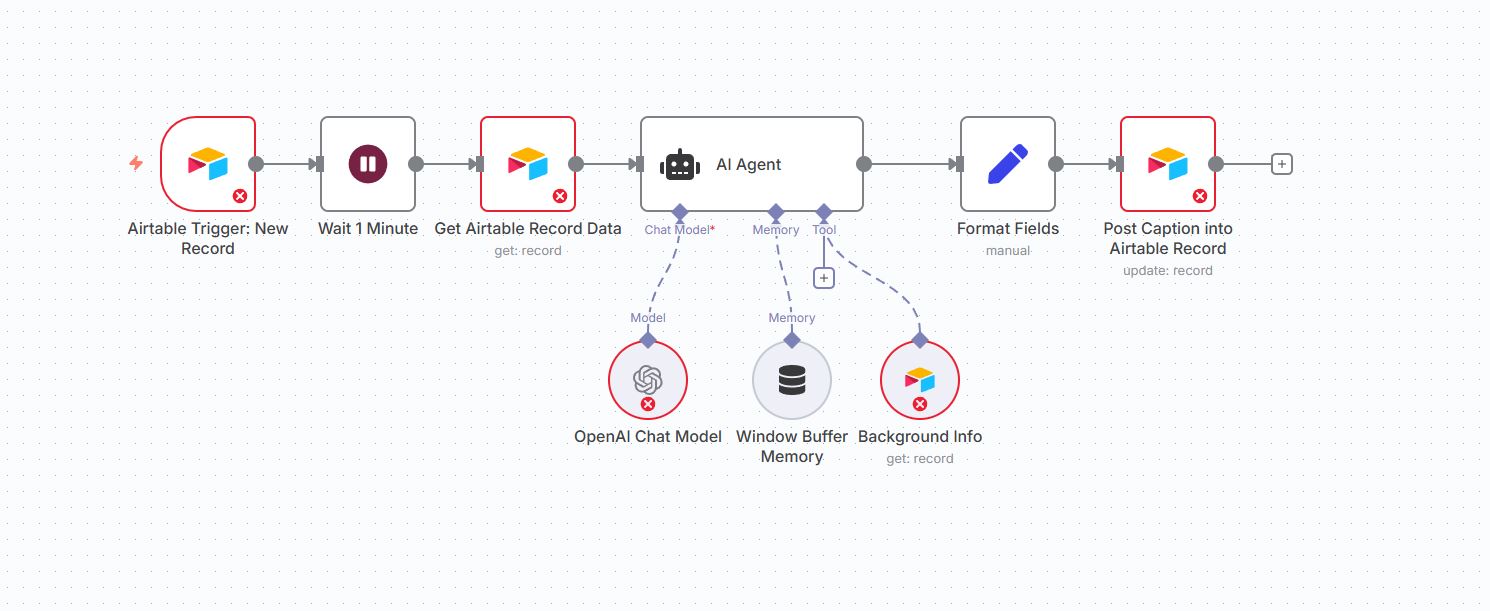 Automatically posts the caption back into Airtable for instant publishing readiness.