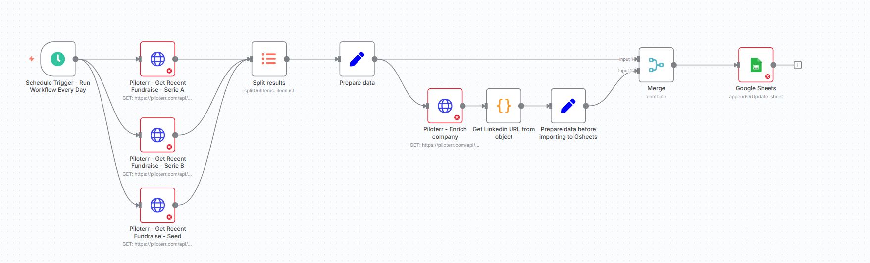 Wake up to a fresh list of companies that just raised money—ready for outreach, enrichment, or scoring. This automation runs on a daily schedule, queries recent Seed, Series A, and Series B funding rounds via Piloterr (Crunchbase data), enriches each company with key attributes (website host, employee count, location, total funding, monthly traffic), extracts the LinkedIn profile, and appends or updates a structured row in Google Sheets keyed by the unique event permalink. A merge step guarantees each enriched record aligns with its base event, and the sheet schema is pre-mapped for rapid activation by growth and sales teams.
