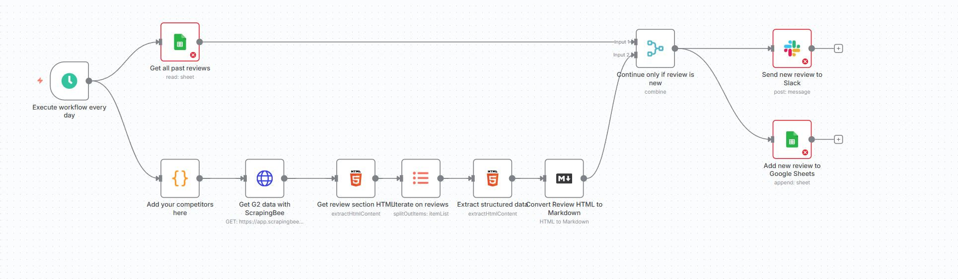 Stay ahead of competitor sentiment without lifting a finger. This automation runs on a daily schedule, scrapes the latest G2 reviews for the competitors you specify, parses and structures the content, de-duplicates against your existing archive, then alerts your team in Slack and logs the new reviews to Google Sheets for analysis. It’s a complete, zero-touch competitor listening loop that turns public feedback into actionable intelligence.