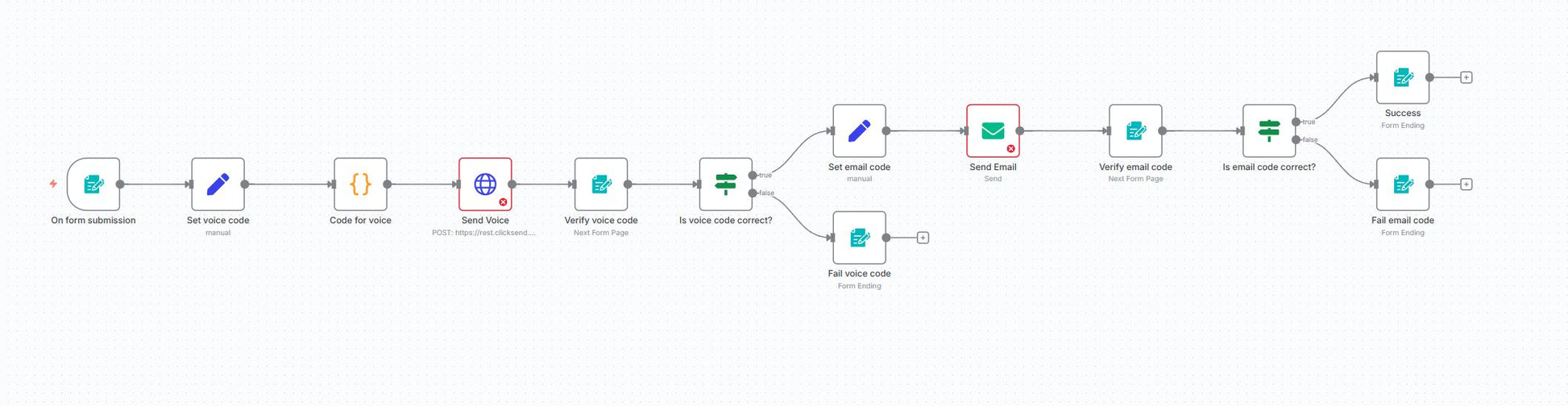 This automation delivers a two-step identity check that combines a text-to-speech phone call with a follow-up email code—ideal for secure sign-ups, high-risk actions, or KYC flows. Users submit a form with phone, language, voice, and email; the system places a ClickSend voice call that reads a verification code, then asks the user to confirm it. On success, it sends a second code via SMTP email and verifies that as well, completing a dual-factor check with clear success/failure paths. Supported languages are selectable (e.g., EN/IT/DE/ES/FR and more), and machine detection helps avoid voicemail traps.