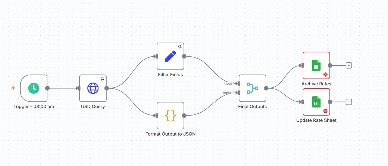 Finance teams and operators waste time copy–pasting rates and risk stale numbers. This automation guarantees a single, reliable pipeline for both live pricing and trend tracking—no manual steps, no timezone confusion.