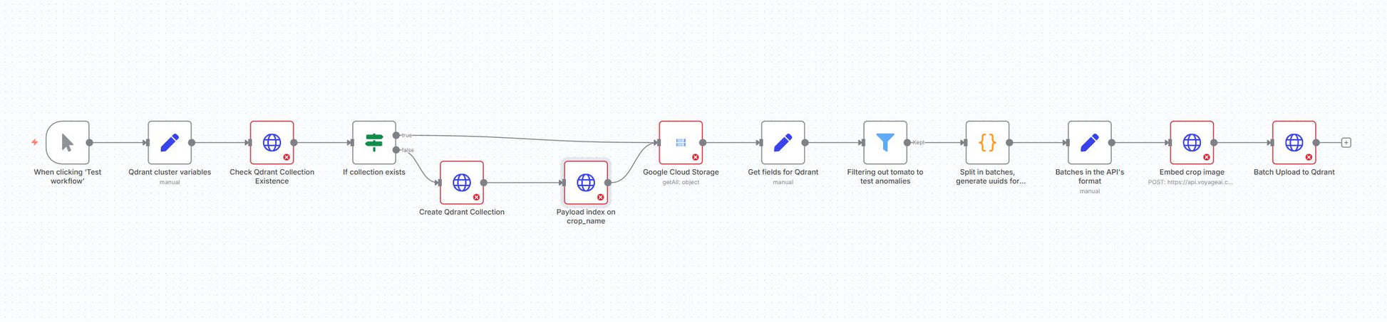 This automation is a production-grade ingestion pipeline that turns raw image datasets into searchable vectors inside Qdrant. It reads images from Google Cloud Storage, constructs public-safe URLs, generates multimodal embeddings with Voyage AI in controllable batches, and bulk-upserts the vectors plus payload metadata into a Qdrant collection. The workflow also provisions the collection (named vectors, vector size, metric), establishes a payload index for fast filtering on crop_name, filters out specified classes for anomaly experiments, and guarantees stable IDs per point via UUIDs.