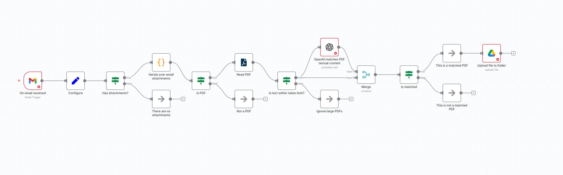 This production-grade automation watches your Gmail inbox for new emails with attachments, intelligently inspects each file with OpenAI, and uploads only the relevant PDFs (e.g., invoices, payslips, contracts) to the correct Google Drive folder. It’s built with safeguards for large files, strict PDF checks, and configurable matching rules—so you get a zero-touch, low-risk pipeline from inbox to archive.