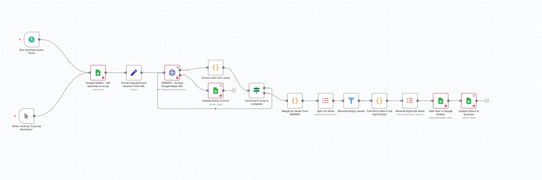 This automation turns any list of Google Maps searches into a continuously refreshed leads database. It reads your search URLs from Google Sheets, extracts the keyword and geo parameters, scrapes Google Maps results through SerpAPI with full pagination, merges the batches, de-duplicates by place_id, and appends/updates rich business data back into a Results sheet (position, title, phone, website, rating, reviews, address, coords, photos/reviews links, and more). It can run hourly or on demand, and marks each input row Success/Error so operators see status at a glance.