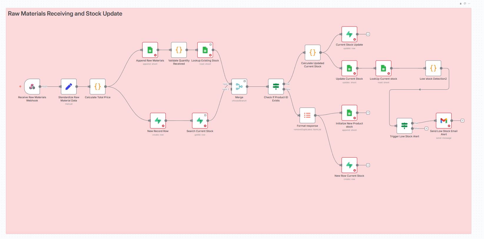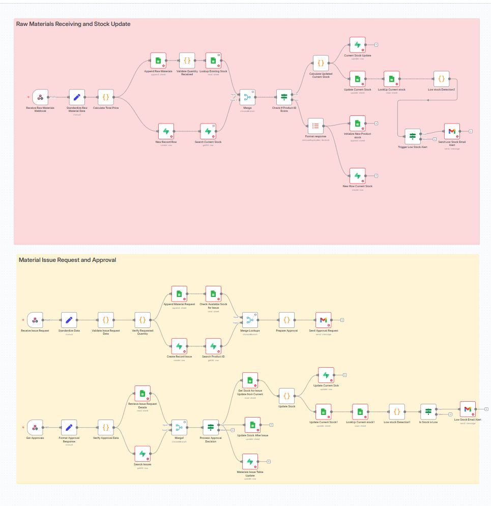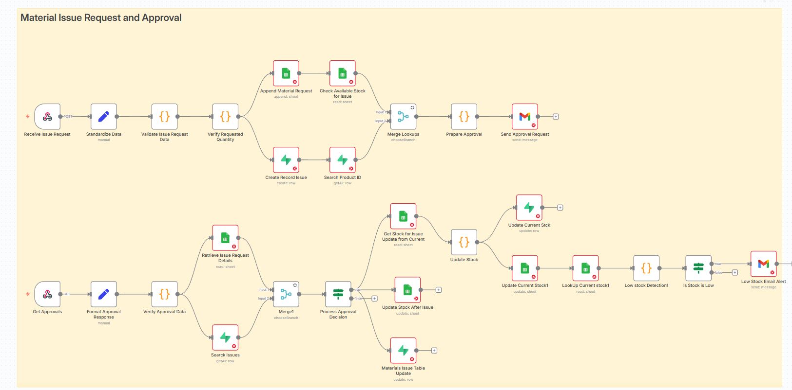 Inventra AI is a complete raw materials inventory and approval system. It automatically records receipts, validates and routes material issue requests for approval, updates stock levels, and sends low stock alerts — all integrated with Google Sheets, Supabase, and Gmail.