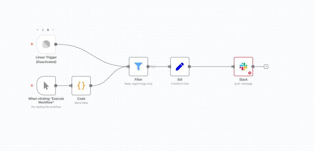 This automation alerts your team in Slack the moment an urgent bug is created in Linear. It listens to issue events, filters out noise, normalizes the message, and posts a channel alert so engineers can swarm high-impact problems immediately. A manual test path with mock data is included so you can validate the flow before switching on the live trigger.