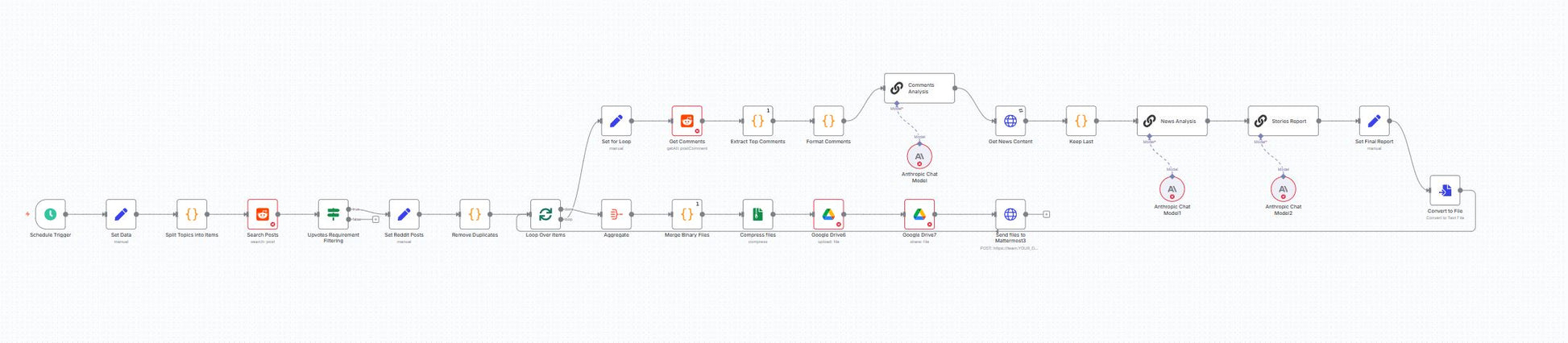 Subtendr AI turns Reddit chatter into weekly PR opportunities. It searches trending posts, extracts sentiment from top comments, analyzes linked news, and generates ready-to-use PR story ideas—automatically delivered to your team via Google Drive and Mattermost.