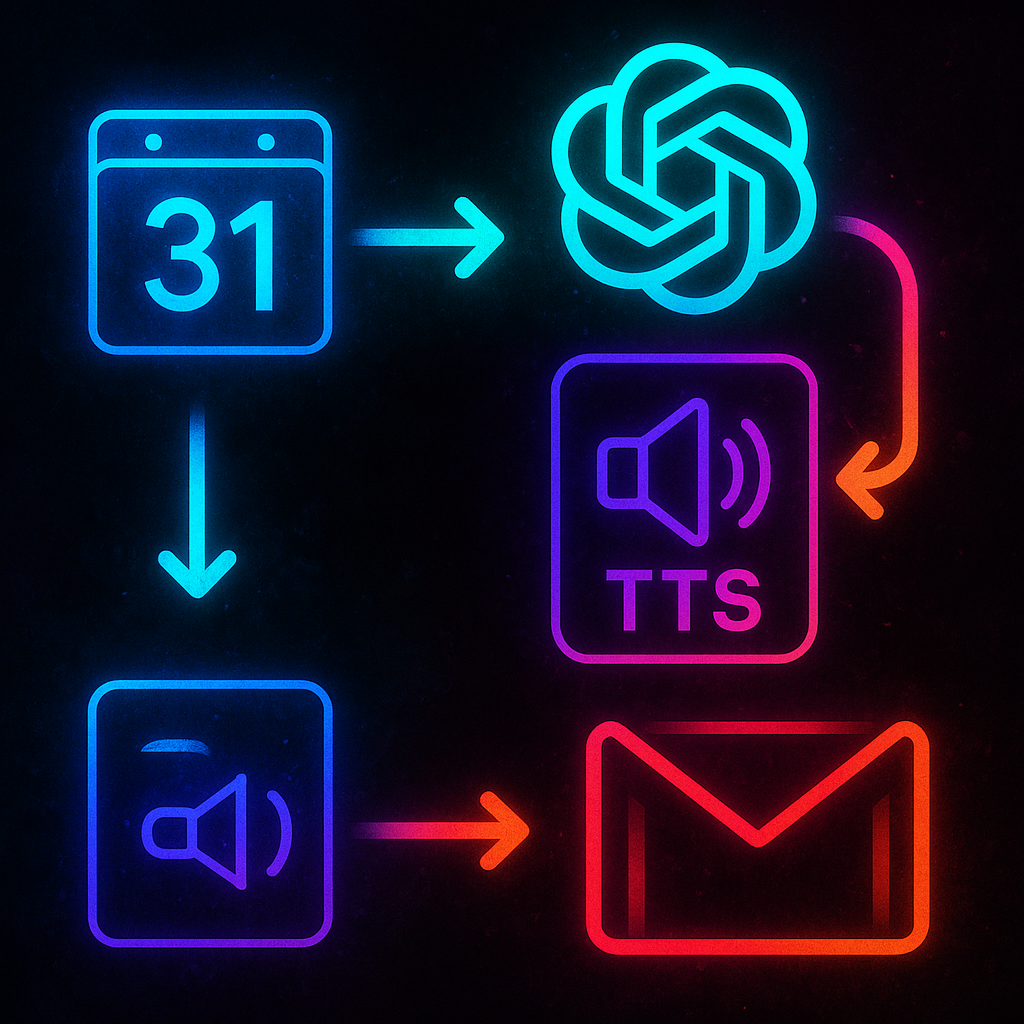 VocalMeet turns tomorrow’s calendar appointments into polished voice reminders delivered by email. It reads your upcoming events, drafts a natural-sounding reminder with the attendee’s name, exact time (“half past three”), and full street address, generates a studio-quality MP3, and sends it to the attendee with a neat subject line.